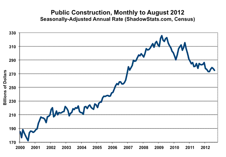Decline in August Construction Spending Continued to Reflect Bottom-Bouncing. The trend of stagnation in construction spending, at low levels of activity, remained in place, as of the latest survey. The Census Bureau reported October 1st that the total value of construction put in place in the United States during August 2012 was $837.1 billion, on a seasonally-adjusted—but not inflation-adjusted—annual-rate basis. That estimate was down for the month by a statistically-insignificant 0.6% +/- 2.5% (all confidence intervals are at a 95% level), from an upwardly revised $842.0 billion (previously $834.4 billion) in July. Before prior-period revisions, the August spending level actually was up by 0.3% from initial July reporting. The monthly decline for July versus June was revised to 0.4% (previously 0.9%).