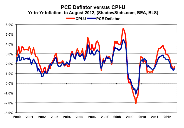 PCE Deflator versus Other Inflation Measures. Where, in theory the PCE deflator measure should be virtually identical to the chain-weighted-CPI (C-CPI-U) (see Commentary No. 470 for details of the latest C-CPI-U and other inflation measures), it did catch-up with the C-CPI-U in the two most recent months of reporting, as shown in the accompanying graphs. The August 2012 PCE deflator showed 1.5% year-to-year inflation, versus 1.3% in July. That compared with annual inflation in the August C-CPI-U at 1.5%, versus 1.3% in July; August CPI-U at 1.7%, versus 1.4% in July; August CPI-W at 1.7%, versus 1.3% in July; and the August SGS-Alternate (1980-Base) at 9.3%, versus 9.0% in July.