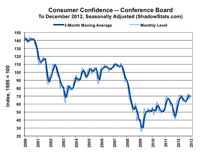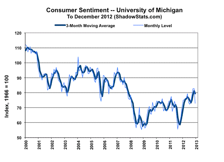 As shown in the accompanying graphs, the December 2012 consumer confidence (Conference Board) and consumer sentiment (University of Michigan) readings both took large month-to-month plunges, with the smoothed data (three-month moving averages) remaining deep within traditional recession readings. Beyond consumers lacking both the income and credit to generate sustained growth in personal consumption, which accounts for more than 70% of GDP, deteriorating confidence numbers usually are suggestive of an intensifying lack of willingness among consumers to take on new spending.