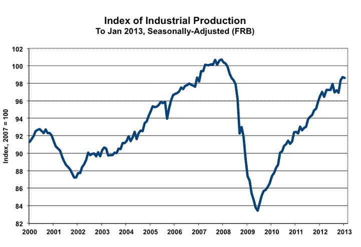 January Industrial Production. January 2013 industrial production showed a headline 0.10% monthly contraction, versus a revised 0.38% gain in December 2012. Year-to-year growth slowing to 2.10%, from a revised 2.90% in December. While the annual reading for January was the lowest since February 2010, when production was turning higher, the last time that annual production growth slowed to 2.10% was in December 2007, the month officially designated as the beginning of the 2007 recession.