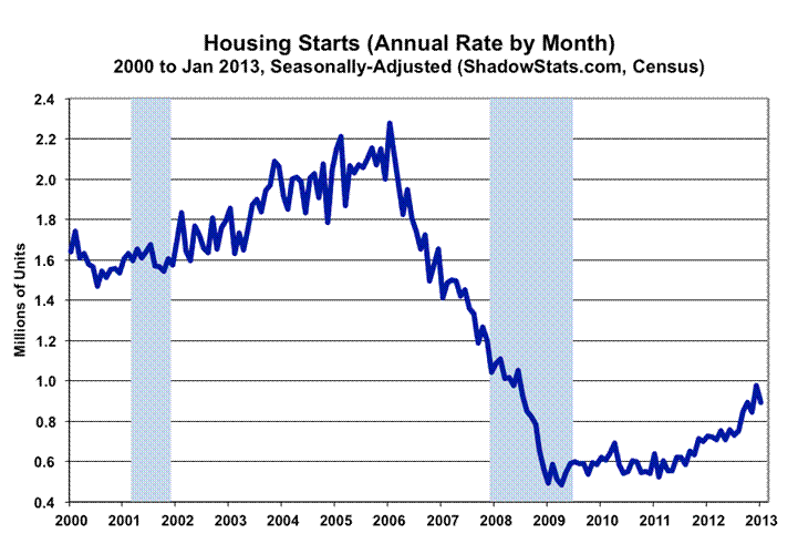January 2013 Housing Starts. The 8.5% headline monthly decline in January housing starts was statistically insignificant, as almost always has been the case in terms of headline change for this series in recent years. January starts came in at an annualized pace of 890,000 units, down from an upwardly revised 973,000 (previously 954,000 units) in December, which was up from a downwardly revised 841,000 (previously 851,000) units in November.