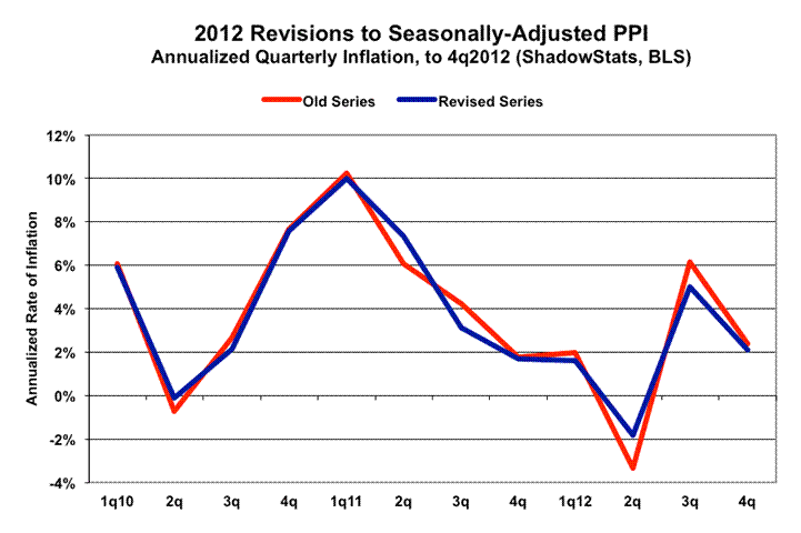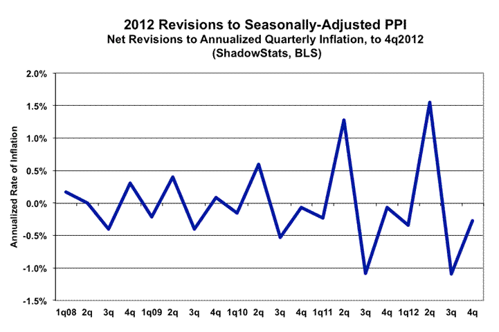 January 2013 PPI. In the context of just-published annual revisions to the monthly PPI data, the headline January, seasonally-adjusted finished-goods PPI rose by 0.20% (up by 0.57% unadjusted). That followed a revised seasonally-adjusted 0.25% (0.20%) monthly decline in December, and a revised 0.41% (previously 0.71%) decline in November. The revisions, back to January 2008—discussed in the next section—affected the adjusted data only, not the unadjusted numbers. The volatility and instabilities reflected in the revisions, however, show that the seasonally-adjusted headline reporting of inflation indeed can be distorted heavily, certainly uncertain.