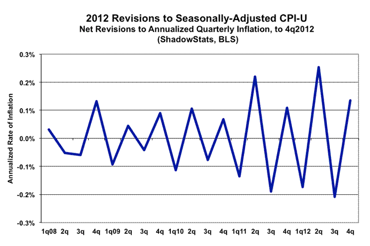 Just published annual revisions to the seasonally-adjusted CPI and PPI series are discussed and graphed in this Opening Comments section. With the unadjusted data unchanged, there is no shift in the year-to-year inflation patterns; there is no impact on the Shadow Stats alternate CPI measures. The shift in CPI monthly and quarterly inflation patterns, however, could impact the otherwise meaningless, annualized quarter-to-quarter growth patterns in GDP reporting.