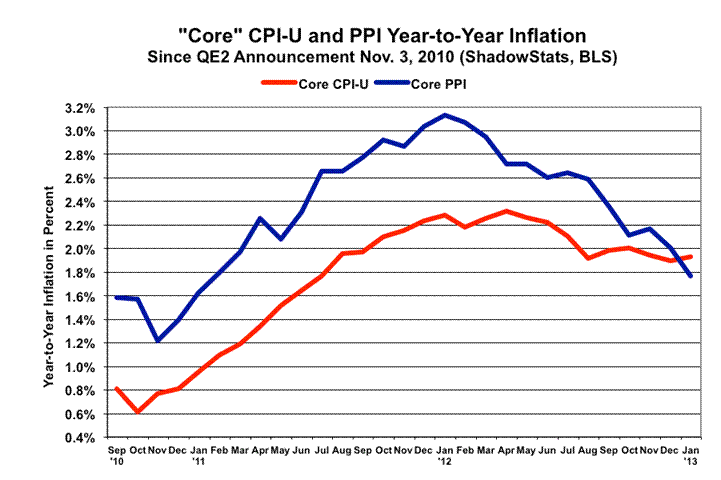 Twenty of the last twenty-six months have shown rising year-to-year, or annual, core CPI-U inflation (net of food and energy inflation), with the January 2013 year-to-year core rate rising minimally to 1.93% from 1.89% in December. The PPI annual core inflation continued turning lower, to 1.77% in January, from 2.00% in December.