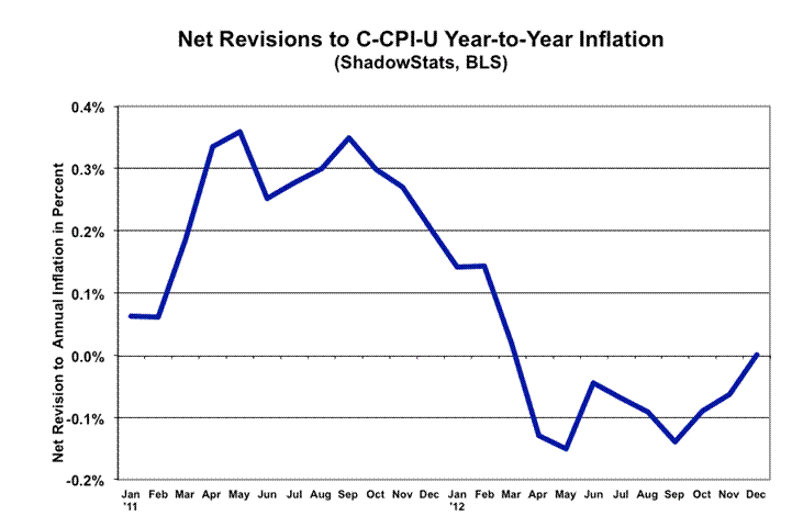 As discussed in Commentary No. 504, annualized, seasonally-adjusted quarterly inflation for the CPI-U revised to 2.19% (previously 2.05% in fourth-quarter 2012, versus 2.09% (previously 2.30%) in the third-quarter, 1.01% (previously 0.75%) in the second-quarter, and 2.31% (previously 2.48%) in the first-quarter.