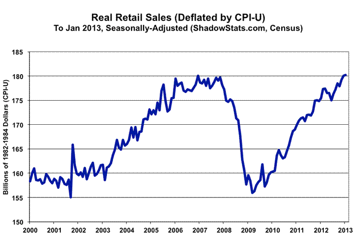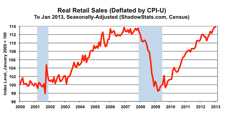 Real (Inflation-Adjusted) Retail Sales. As discussed with the nominal (not-adjusted-for-inflation) retail sales reporting for January 2013 in Commentary No. 502, the seasonally-adjusted headline January retail sales gained 0.1% (0.13%) for the month, following a revised 0.5% (0.50%) monthly gain in December. Aside from the nominal (not-adjusted-for-inflation) monthly sales gains in January and December lacking statistical significance, reporting of actual sales activity continued to be clouded by the use of unusually unstable and questionable seasonal adjustments.