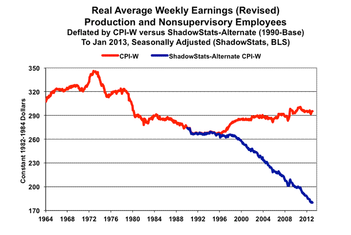 In the graph, the red line reflects the earnings series as officially deflated by the BLS. As the inflation-depressing methodologies of the 1990s began to kick-in, the artificially weakened CPI-W (also used in Social Security cost-of-living adjustments) helped to prop up the reported real earnings. Official real earnings today still have not recovered their inflation-adjusted levels of the early-1970s, and, at best, have been flat for the last decade.