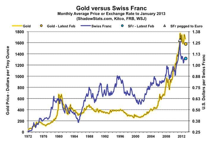 Monthly Gold Graphs. Following are the regular graphs of gold prices versus the Swiss franc, oil prices and silver prices that usually accompany the Commentary on the monthly CPI release. Market volatility in response to the release of the most-recent FOMC minutes is indicated in the graphs, as we go to press, with the “Latest February” (February 22nd) points.