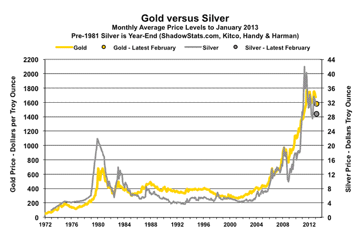 In like manner, the all-time high nominal price for silver in January 1980 of $49.45 per troy ounce (London afternoon fix, per silverinstitute.org), although approached in 2011, still has not been hit since 1980, including in terms of inflation-adjusted dollars. Based on January 2013 CPI-U inflation, the 1980 silver-price peak would be $146 per troy ounce and would be $565 per troy ounce in terms of January 2013 ShadowStats-Alternate-CPI (1980-based) adjusted dollars (again, all series not seasonally adjusted).