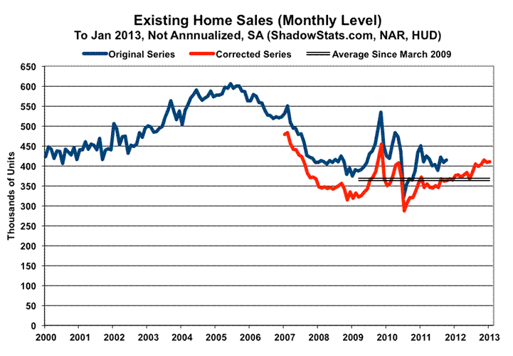 January 2013 Existing Home Sales Reporting. The February 21st release of January 2013 existing-home sales (counted based on actual closings, National Association of Realtors [NAR]) showed a seasonally-adjusted monthly gain of 0.4% (a decline of 0.4% before prior-period revisions). January’s 0.4% sales gain, to seasonally-adjusted monthly unit sales pace of 410,000 (an annualized pace of 4,920,000), was well within the normal month-to-month volatility for this series. The monthly change in December 2012 sales was a revised decline of 1.2% (previously 1.0%).