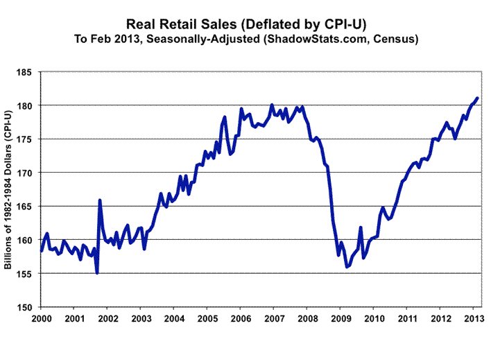 Real (Inflation-Adjusted) Retail Sales. Indeed, the bulk of the February surge in nominal (not-adjusted-for-inflation) retail sales reporting for February 2013 was from rising prices. The seasonally-adjusted, headline nominal February gain was 1.06% for the month, following a revised 0.22% (previously 0.13%) monthly gain in January (see Commentary No. 509).