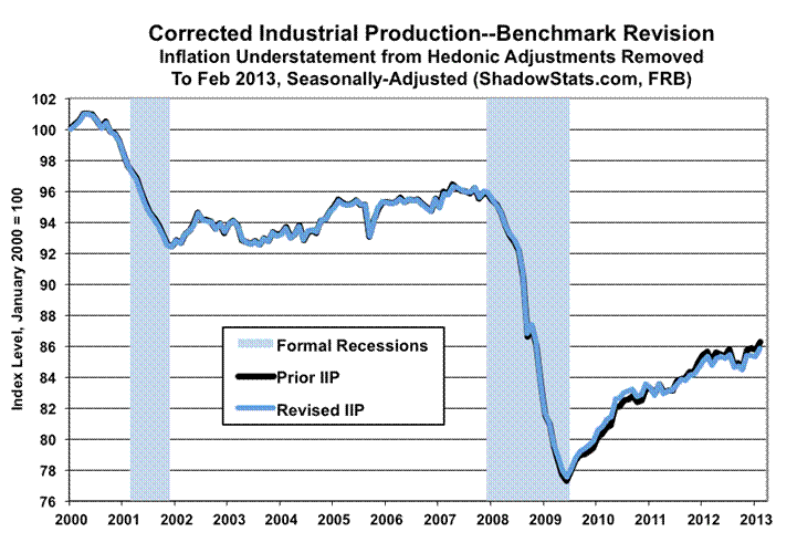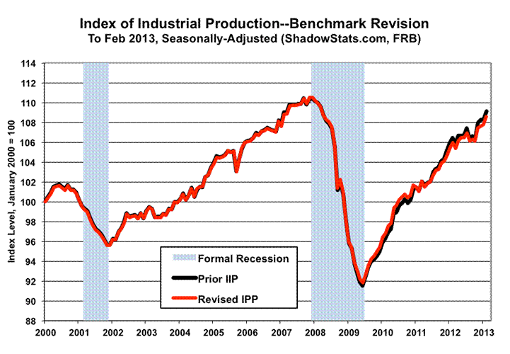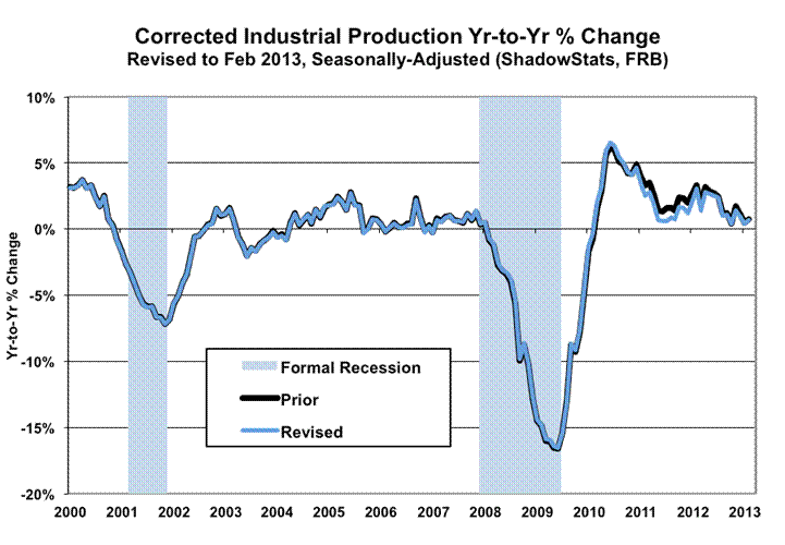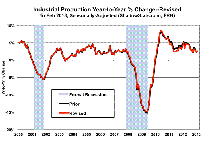 Revised February 2013 Monthly Reporting. Following the March 22nd benchmark revisions to the industrial production series, the revised headline, seasonally-adjusted monthly gain for February 2013 production was 0.75% (previously 0.71%), versus 0.15% (previously 0.05%) in January 2013, and against 0.14% (previously 0.27%) in December 2012. The revisions to annual growth were to the downside, with revised year-to-year gains of 2.46% (previously 2.52%) in February 2013, 2.19% (previously 2.28%) in January 2013 and 2.76% (previously 2.93%) in December 2012.