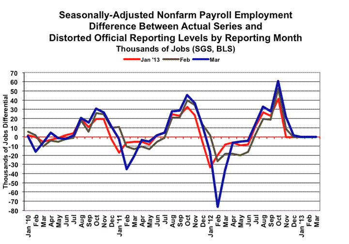 Distortions in the post-benchmark environment already have surfaced, even though the data are based on the initial public reporting of the benchmark revision. The reason for this is that the benchmark revision actually was run internally by the BLS, based on October 2012 numbers. With subsequent internal runs in November, December and January 2013, three months of revisions already had skewed the January data, as shown in the accompanying graph. The line for February reflects only one month subsequent of new seasonal-factor revisions, and the March line reflects a second month, with mounting seasonal instabilities. Without distortions, the plotted lines would be flat and at zero.