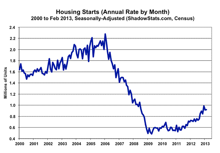 The next two graphs cover private residential construction, including housing starts, as reported for February 2013 (see Commentary No. 511 for detail). The difference in the graphs is the smoother pace of actual spending (not-adjusted-for-inflation), instead of the more-irregular monthly variation in the count of physical monthly starts.