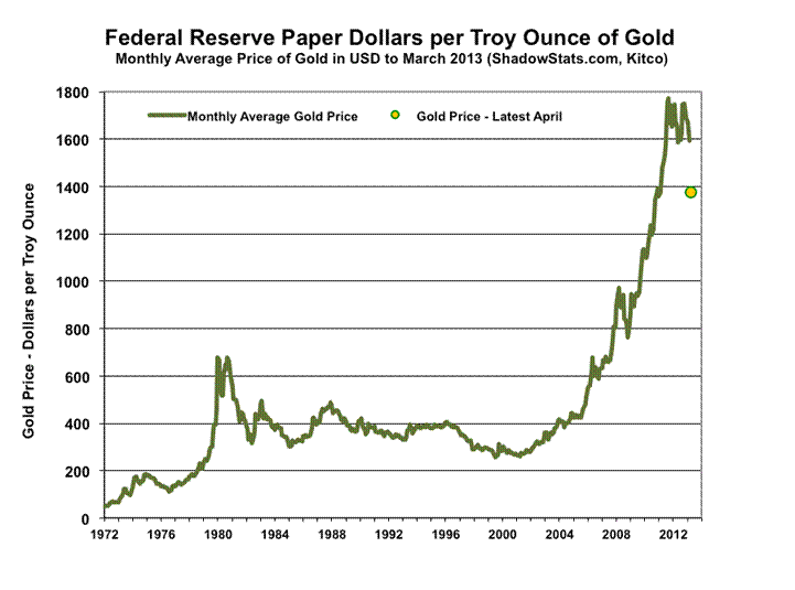 As shown in Table 1 on page 50 of Hyperinflation 2012, and as updated in Table III on page 40 of Special Commentary (No. 485), over the decades, the increases in gold and silver prices have compensated for more than the loss of the purchasing power of the U.S. dollar as reflected by CPI inflation, while they effectively have compensated fully for the loss of purchasing power of the dollar based on the ShadowStats-Alternate Consumer Price Measure (1980-Methodologies Base). See the Opening Comments for a discussion on the current turmoil in the precious metals markets, and for the plot of monthly average gold prices regularly found in this section.