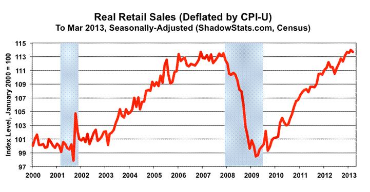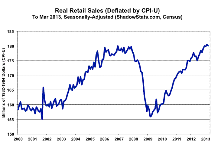 Hitting Pre-Recession Levels. The first of the two preceding graphs shows the level of real retail sales activity (deflated by the CPI-U) since 2000. The second graph shows the same series in full post-World War II detail. With March 2013 reporting, the headline real retail sales series just has recovered pre-recession levels, the only major economic series to do so, other than the GDP, which did that more than a year ago and has kept rising well beyond the reported activity of any other series, since. There is no major economic series showing the GDP’s pattern of official, full recovery and extended new growth.