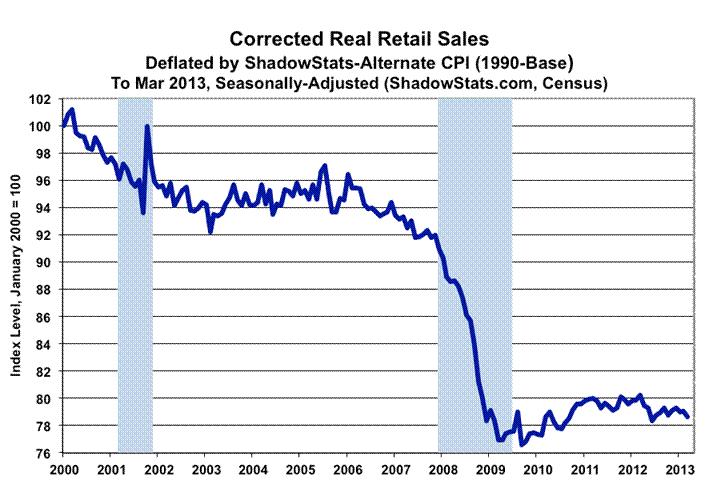 The ShadowStats-Alternate Consumer Inflation Measure (1990-based)—year-to-year consumer inflation was roughly 4.9% in March 2013, versus 5.4% in February. The ShadowStats-Alternate Consumer Inflation Measure (1980-Based) fell to about 9.1% in March, versus 9.6% in February.