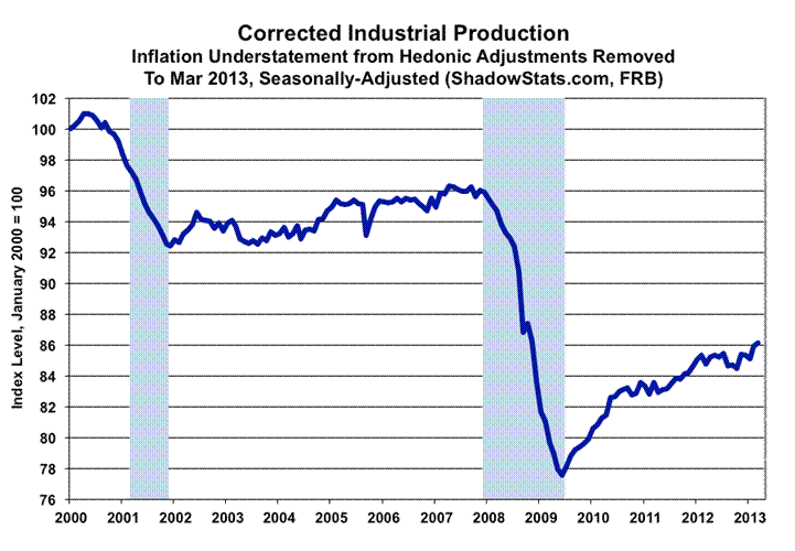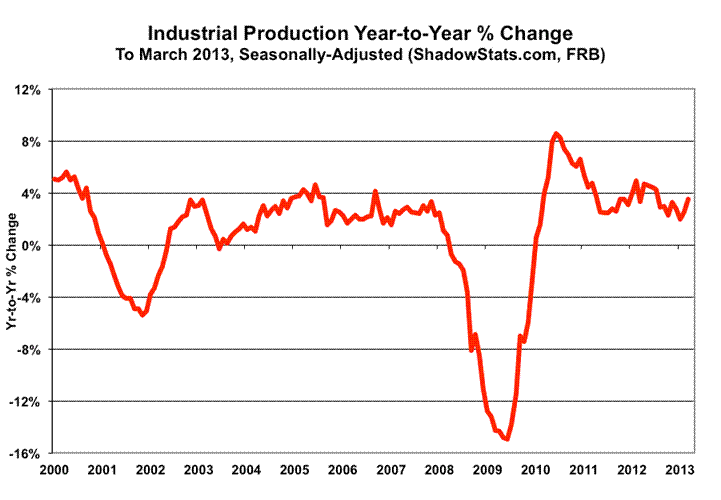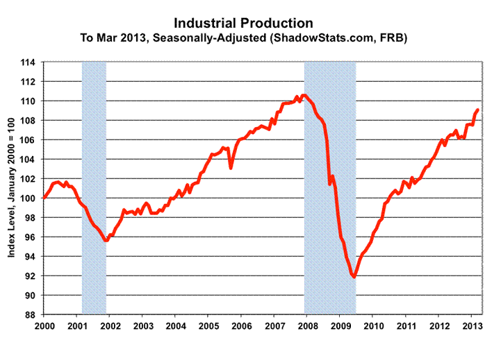 As currently reported by the Federal Reserve, unseasonably cold weather spiked utility usage and related total industrial production in each month of first-quarter 2013. Net of the seasonally-adjusted weather distortions, January production was down by 0.3% for the month, as opposed to the headline 0.1% contraction; February production was up by 0.8% for the month, as opposed to the headline 1.1% gain; and the just-published March production was down by 0.1% for the month, as opposed to the headline 0.4% gain.