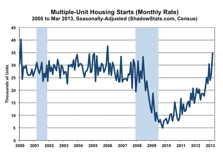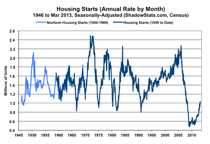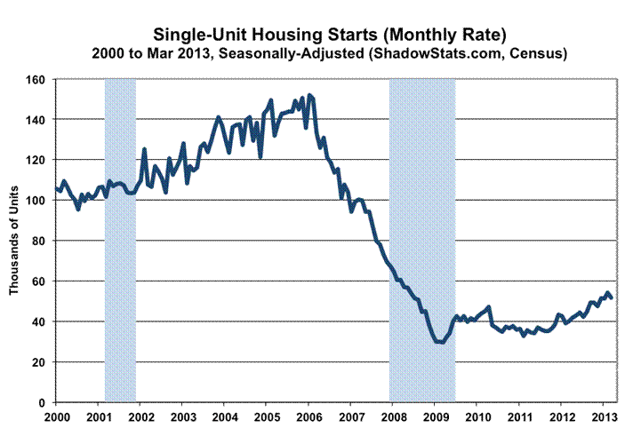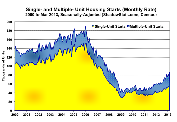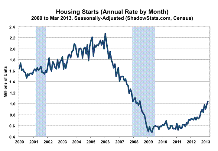 March 2013 Housing Starts. Headline March 2013 housing starts showed a statistically-insignificant monthly gain of 7.0%, versus a revised February gain of 7.3% (previously a 0.8% increase). Current aggregate monthly housing starts activity level is at a post-housing-crash high, well above the record monthly low seen for the present series in April 2009, but the March headline number still is 54% below the 2006 series high. Year-to-year growth in aggregate March housing starts was a statistically-significant increase of 46.7%, following a revised 34.8% (previously 27.7%) annual gain in February.
