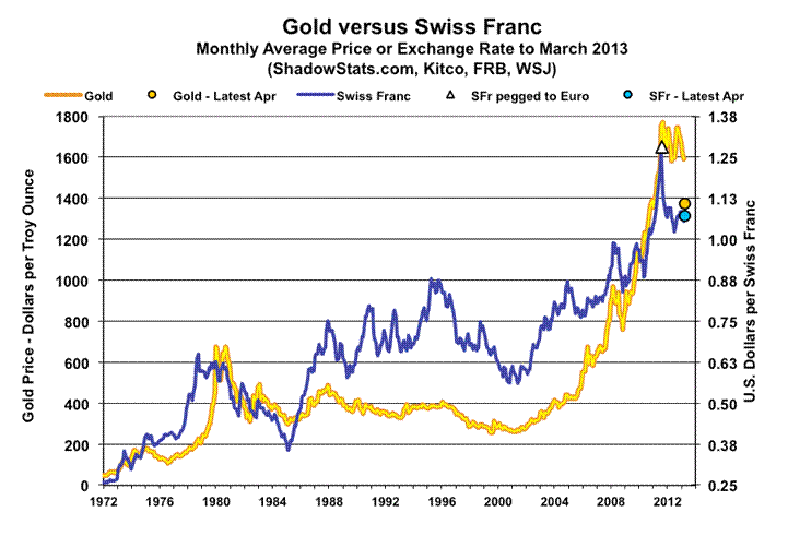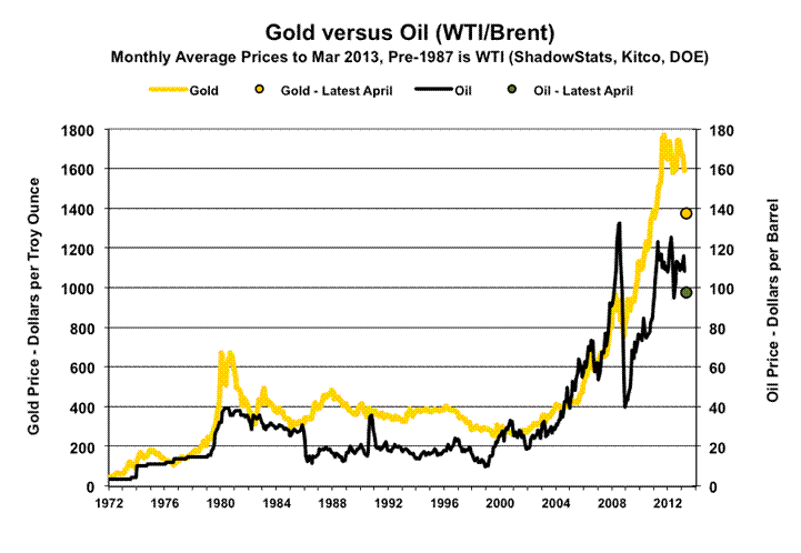 Monthly Gold Graphs. Preceding are the regular graphs of gold prices versus the Swiss franc, oil prices and silver prices that usually accompany the Commentary on the monthly CPI release. What should prove to be a short-lived crash in precious metals prices and a sharp decline in oil prices is reflected in these graphs. The dollar is not much changed—actually has seen some relative weakness—versus the Swiss franc. The “latest April” points in the graphs are late-day April 17th market prices in the U.S.