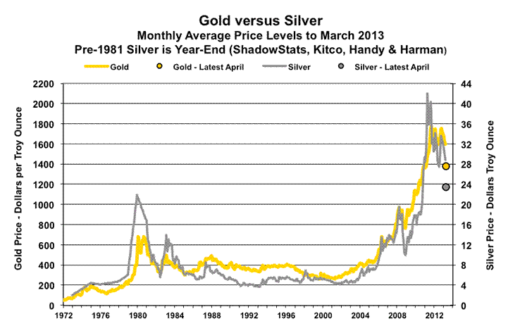 In like manner, the all-time high nominal price for silver in January 1980 of $49.45 per troy ounce (London afternoon fix, per silverinstitute.org), although approached in 2011, still has not been hit since 1980, including in terms of inflation-adjusted dollars. Based on March 2013 CPI-U inflation, the 1980 silver-price peak would be $148 per troy ounce and would be $583 per troy ounce in terms of March 2013 ShadowStats-Alternate-CPI (1980-based) adjusted dollars (again, all series not seasonally adjusted).