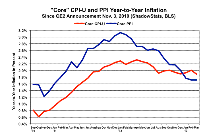 On a year-to-year basis, March 2013 inflation slowed to 1.47% from 1.98% in February. While those numbers are prepared consistently and are not seasonally adjusted, there are other issues in terms of methodological changes—made to the series in recent decades—that were designed to understate the government’s reporting of consumer inflation, as discussed in the updated Public Comment on Inflation Measurement and the Chained-CPI.