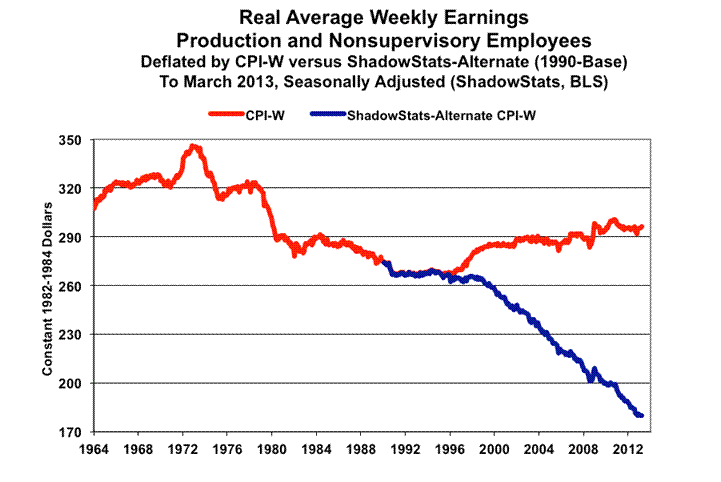 Official real earnings today still have not recovered their inflation-adjusted levels of the early-1970s, and, at best, have been flat for the last decade. Deflated by the ShadowStats measure, real earnings have been in fairly regular decline for the last four decades, which is much closer to common experience than the pattern suggested by the CPI-W. See Public Commentary on Inflation Measurement and Chained-CPI for further detail.