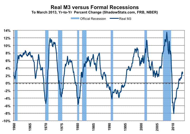 Real Money Supply M3. The signal for a double-dip or ongoing recession, based on annual contraction in the real (inflation-adjusted) broad money supply (M3), discussed in Hyperinflation 2012, remains in place and continues, despite real annual M3 growth having turned to the upside. As shown in the preceding graph—based on March 2013 CPI-U reporting and the latest ShadowStats-Ongoing M3 Estimate—annual inflation-adjusted growth in M3 for March 2013 rose to 2.8%, from an unrevised 2.4% in February. The difference was split between a continuing decline in M3 annual growth and a more-than-offsetting decline in year-to-year CPI-U inflation.