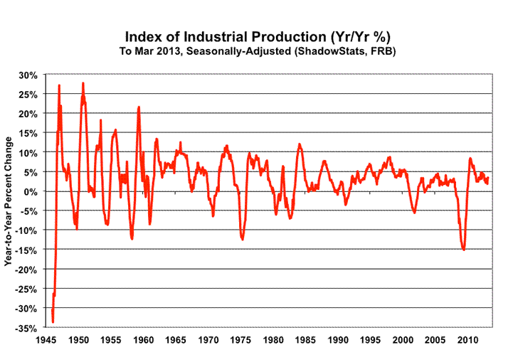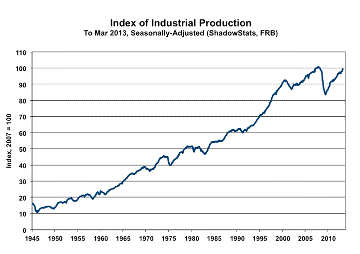 March 2013 Industrial Production. In the context of recently published benchmark revisions (see Commentary No. 512), which restated the detail of the industrial production index back to 1919, with net downside revisions to activity in the most-recent years, headline March 2013 industrial production was reported with a monthly headline gain of 0.41%, versus a February gain of 1.08%.