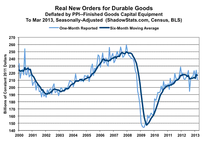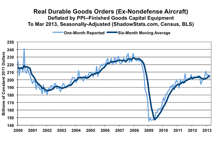 In terms of inflation-adjusted levels, as indicated in the two graphs in the Opening Comments section, both the smoothed aggregate new orders and aggregate orders net of commercial aircraft series, have shown a slowing uptrend and flattening-out in the last two-to-three years. Now generally in a pattern of downturn, the series clearly is not in recovery as seen in official GDP reporting. The real (inflation-adjusted) level of orders in March 2013 remained below both the pre-2001 and pre-2007 recession highs.