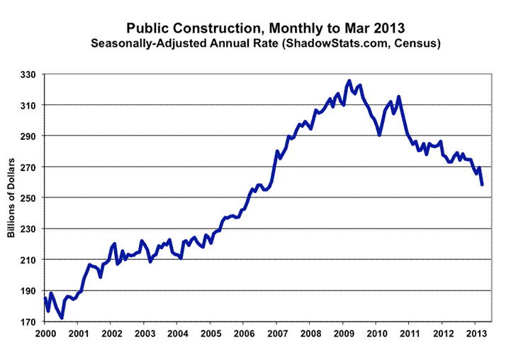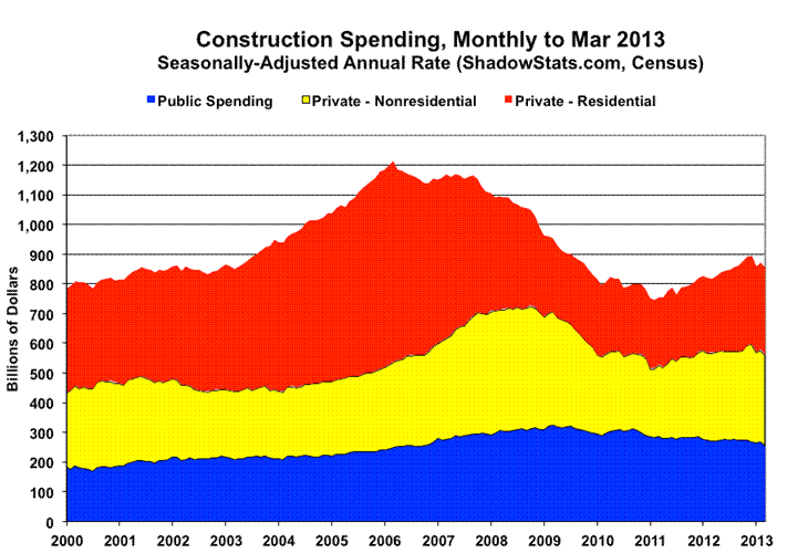 The preceding two graphs reflect total construction spending through March 2013, the first is before inflation adjustment; the second is an aggregate index reflecting inflation-adjusted data. The second graph (see also Opening Comments) shows the March 2013 ShadowStats estimation of an inflation-adjusted construction spending series. There is no perfect inflation measure for deflating construction, but the PPI new construction index is the closest found in publicly available series. Adjusted for the PPI measure, construction spending shows the economy slowing in 2006, plunging into 2011, turning minimally higher in an environment of low-level stagnation, and faltering anew in the most recent reporting. The pattern of inflation-adjusted activity here does not confirm the economic recovery shown in the headline GDP series (see Commentary No. 519). To the contrary, the latest construction reporting, both before and after inflation adjustment, shows a developing, renewed decline in activity.