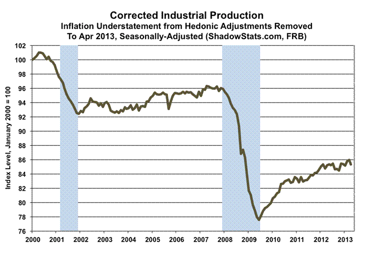 The “corrected” graph does show some growth in the period following the official June 2009 near-term trough in production activity. Yet, that upturn has been far shy of the full recovery and renewed expansion reported in official GDP estimates. Production levels have not regained pre-recession highs (even uncorrected), but, instead, entered a period of protracted low-level stagnation in 2012, with a quarterly contraction in third-quarter 2012, followed by continued stagnation and new indications of a renewed economic downturn.
