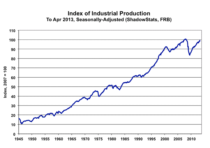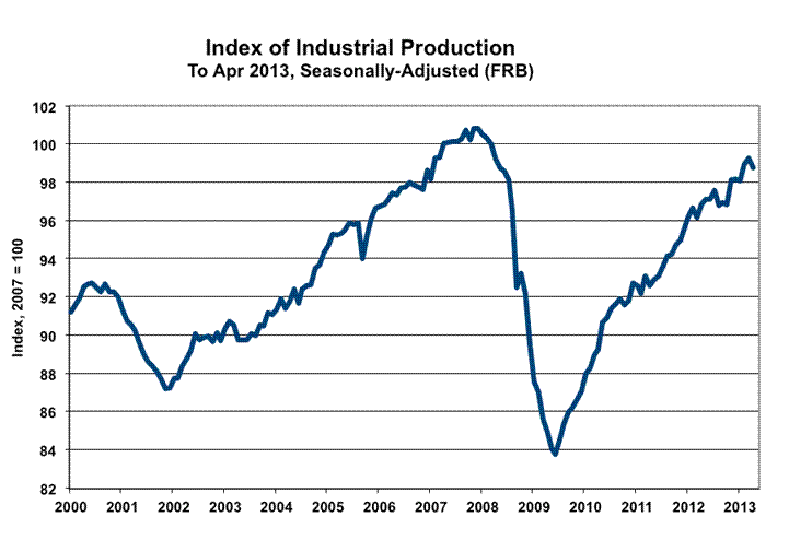 April 2013 Industrial Production. This morning’s (May 15th) Federal Reserve Board release of April 2013 industrial production activity showed a seasonally-adjusted, headline monthly contraction of 0.54% (down by 0.74% before prior-period revisions). That contraction was against a downwardly revised 0.32% (previously 0.41%) gain in March and a downwardly revised 0.91% (previously 1.06%, initially 0.75%) gain in February. Suggestive of a possible renewed contraction in broad economic activity, the April index level of 98.7 was slightly below the average level of 98.8 in first-quarter 2013.