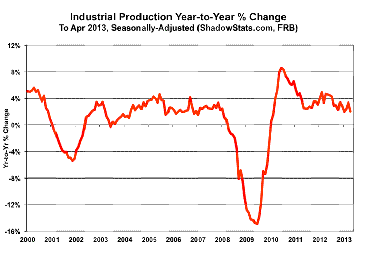 April Industrial Production Suggestive of Renewed Downturn. In the context of downside prior-period revisions, April industrial production contracted at a headline monthly pace of 0.5%. That started the second-quarter 2013 at a level below that of the first-quarter. Further, April’s annual growth slowed to a 1.9% pace. The last time year-to-year production growth slowed to that level (other than in January 2013) was at the formal onset of the 2007 recession. In this highly volatile series, the April reporting generally was consistent with a re-intensification of the economic downturn.