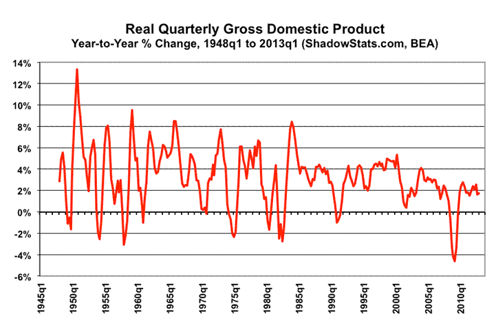 ShadowStats-Alternate GDP. The ShadowStats-Alternate GDP estimate for first-quarter 2013 remains a 2.0% year-to-year contraction, versus the headline gain of 1.8%. The alternate first-quarter estimate is a narrower contraction than the 2.2% estimated for fourth-quarter 2012, versus the official estimate then of 1.7% year-to-year growth (see the Alternate Data tab).