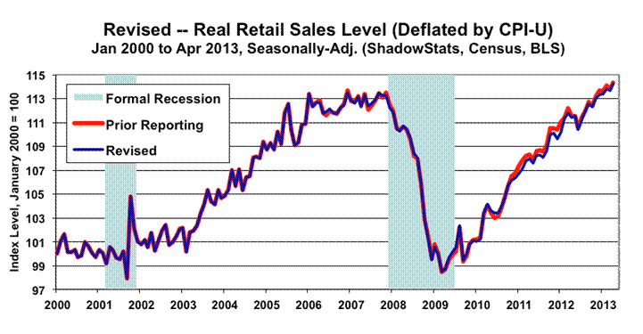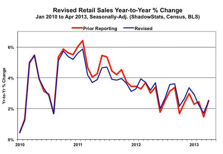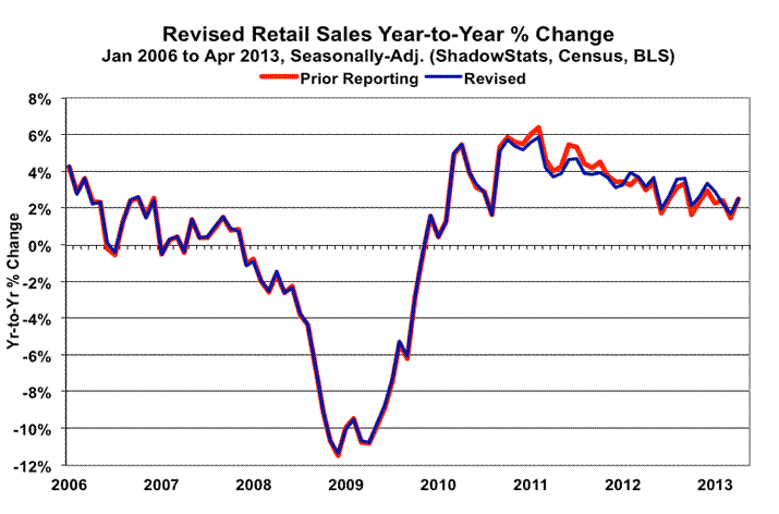 Retail Sales Are Not Quite What They Used to Be. As discussed in the May 29th No. 527: Special Commentary, the broad U.S. economy remains in serious trouble. Reflecting that, the regular stream of annual benchmark revisions to major economic series generally has shown that the post-2009 “recovery” was weaker than previously believed. A common thread between today’s (May 31st) benchmark revision of retail sales, and the recent benchmark revisions to industrial production and new orders for durable goods orders, has become obvious. Where better-quality data were available (usually 2010 and 2011), such as with annual surveys or censuses, the pre-existing reporting was revised lower. Where the revisions included the ongoing, overly-optimistic underlying assumptions that had generated the initial overstatement of activity, the overstatement continues, boosting the revised current levels of activity back up into range of recent reporting.