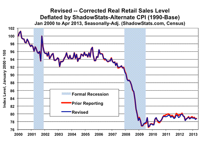 Revised plots of the seasonally-adjust retail sales series are shown the following seven graphs. Except for the first graph, which shows broad, post-World War II real (inflation-adjusted) retail sales activity—updated for the latest revisions—all the other plots show both the revised and prior reporting. The background thicker red line in those graphs reflects the previous estimates. Several of the graphs just show closer detail of the graph before. All the graphs are adjusted for inflation, with Graphs 1 to 5 reflecting sales deflated by the CPI-U, as published regularly by the St. Louis Federal Reserve. Graphs 6 and 7 are corrected for the understatement of the CPI-U inflation using, instead, the ShadowStats 1990 Alternate measure.