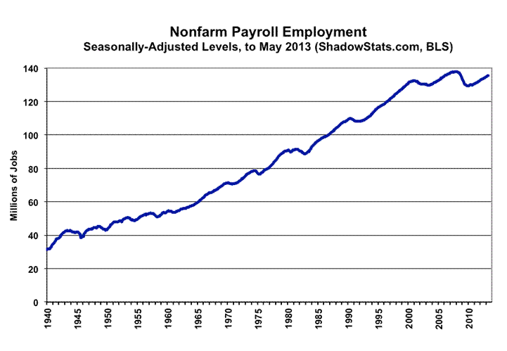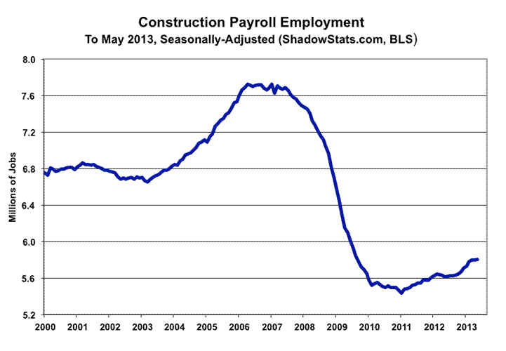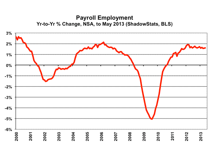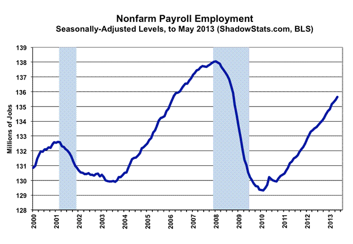 The monthly payroll level still is 2.4-million jobs shy of its pre-recession high, and it puts the lie to the expanding economic recovery propagandized in GDP reporting. To match the purported GDP recovery and expansion, payroll employment should be at least 6.0-million jobs higher, at present. Separately, May 2013 unemployment—as viewed by common experience (the ShadowStats Alternate Measure)—held at the all-time high for the series of 23.0%, a high level that rivals any other downturn of the post-Great Depression era.