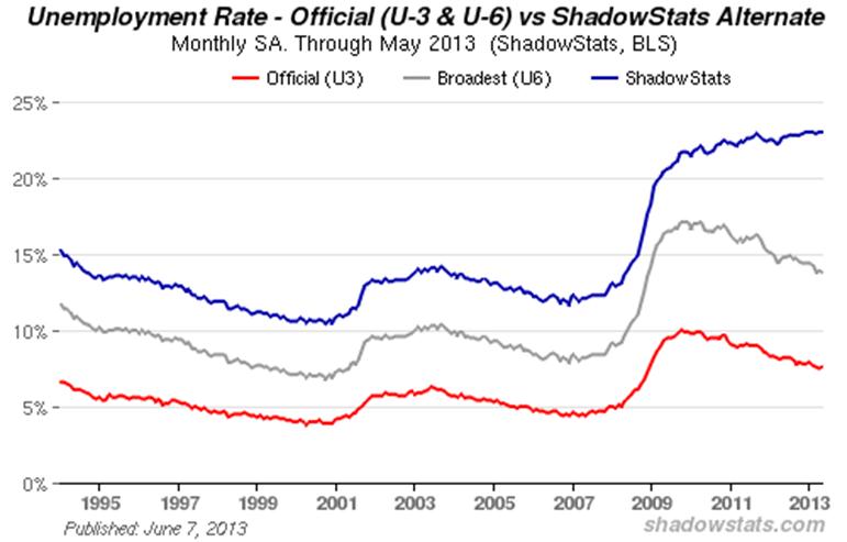 ShadowStats Alternate Unemployment Measure Holds at Series High. As reported, the headline U.3 unemployment rate rose to 7.6% (7.57% to the second decimal point) in May 2013, from 7.5% (7.51%) in April. The broader, headline U.6 measure, which includes a measure for short-term discouraged workers, fell by a notch to 13.8% in May, from 13.9% in April. None of the monthly changes in the headline unemployment measures were meaningful, because each month is calculated separately from, and is not reported in manner consistent with, the prior month’s headline reporting (see the concurrent-seasonal-factor-adjustment discussion in the Reporting Detail section).