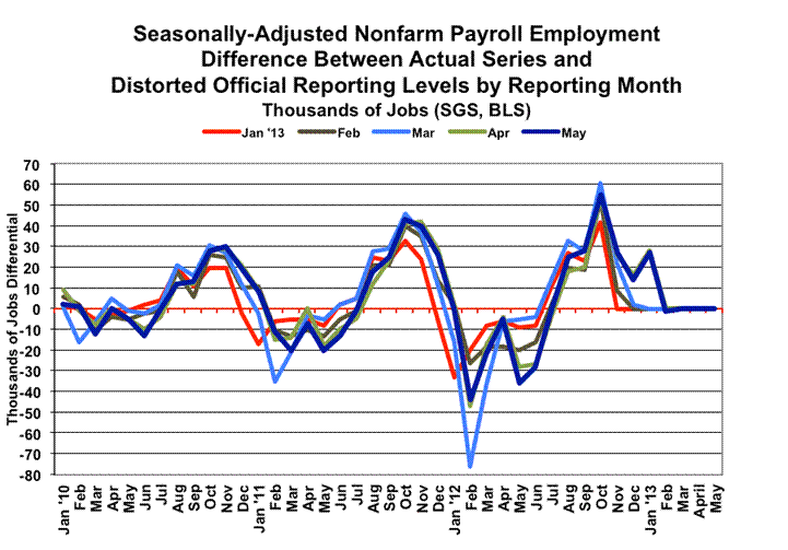 For May 2013 the headline-unemployment rate was 7.6%, and the headline monthly payroll change was a gain of 175,000 jobs. Yet, the reported May 2013 headline unemployment rate was neither consistent with nor comparable to the headline April unemployment rate of 7.5%. While the 175,000 jobs gain for May was consistent with the revised 149,000 jobs increase estimated for April, those increases were not consistent with the new 142,000 jobs gain reported for March or with any earlier published data.