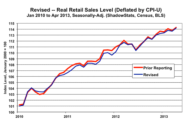 May Retail Sales Gain Was Heavily Distorted and Not Statistically Significant. The statistically-insignificant, headline 0.6% (0.55% at the second decimal point) gain in May 2013 retail sales was before adjustment for inflation, and in the context of the May 31st benchmark revision to retail sales (see Commentary No. 529). The general downside revisions to previously-reported retail sales activity, as reflected in the preceding graph, were seen when better-quality data were available. As reporting history moved forward into the current, overly optimistic assumptions and modeling, the revisions tended to resume the previously-estimated reporting patterns.