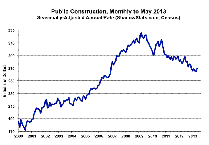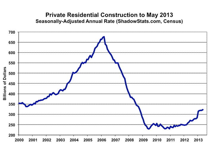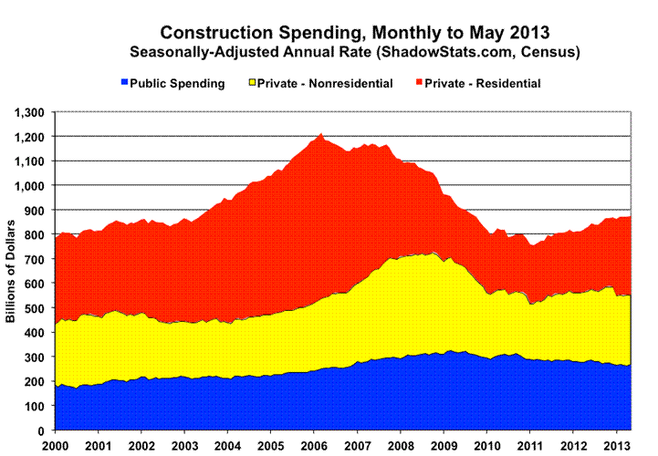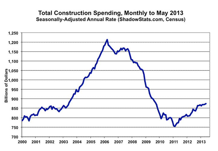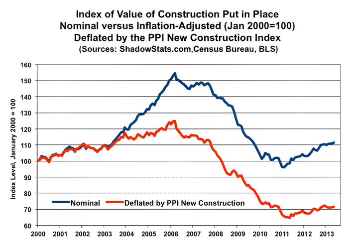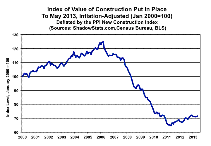 The preceding two graphs reflect total construction spending through May 2013, the first is before inflation adjustment; the second is an aggregate index reflecting inflation-adjusted data. The second graph (see also Opening Comments) shows the May 2013 ShadowStats estimation of an inflation-adjusted construction spending series. There is no perfect inflation measure for deflating construction, but the PPI new construction index is the closest found in publicly available series. Adjusted for the PPI measure, construction spending shows the economy slowing in 2006, plunging into 2011 and then turning minimally higher in an environment of low-level stagnation through the most-recent reporting. The pattern of inflation-adjusted activity here does not confirm the economic recovery shown in the headline GDP series (see Commentary No. 536). To the contrary, the latest construction reporting, both before and after inflation adjustment, and after the benchmark revision, shows a pattern of ongoing stagnation.