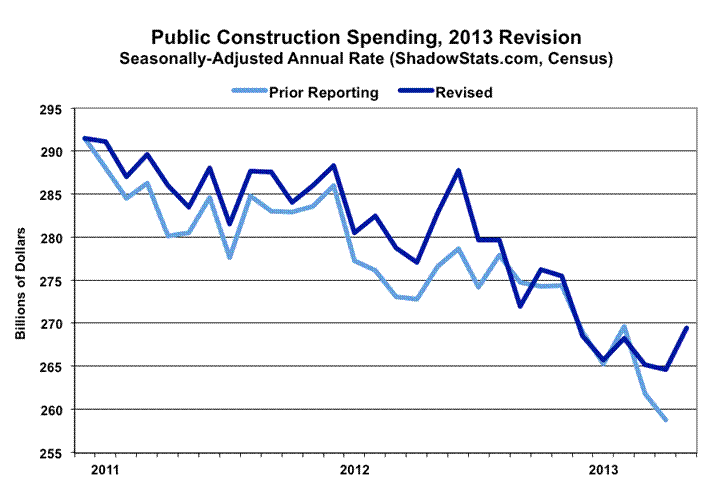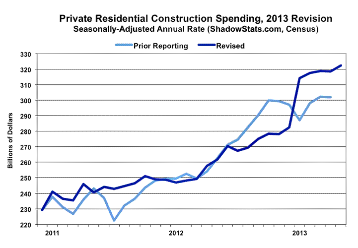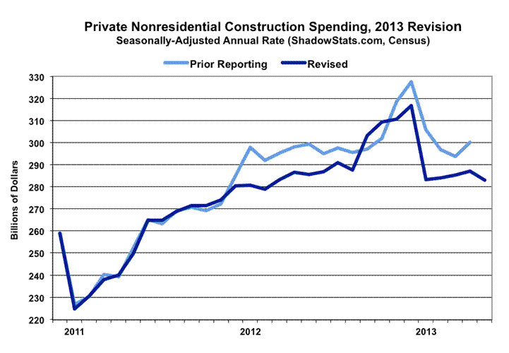 Downside GDP Indicators. This week’s reporting of May trade data and construction spending has generated two sets of negative indicators, both for current- as well as prior-GDP reporting. This morning’s (July 3rd) estimate of the May 2013 trade deficit showed meaningful deterioration. It was enough to turn the second-quarter trade outlook to a net-negative contributor for the upcoming initial estimate of second-quarter GDP growth. With market expectations also disappointed, the consensus outlook also should revise lower for upcoming second-quarter GDP growth. Separately, the July 1st benchmark revision to construction spending showed a net downside revision to 2012 construction activity, versus 2011. The changes were enough to make downside contributions to pending revisions of relative 2012 GDP growth. Both the “advance” estimate of second-quarter 2013 GDP, and the “comprehensive” revisions to the GDP series back to 1929, are due for release on July 31st. ShadowStats will publish, in advance, estimates of the likely nature of the pending revisions.