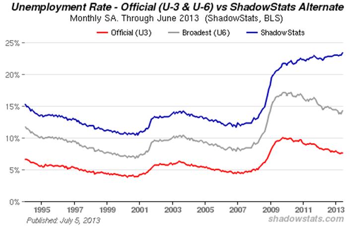 No Economic Recovery Here. [As noted above, today’s Commentary is a holiday-abbreviated version of the full report that will be published on Monday, July 8th.] The June 2013 report on labor conditions, published this morning (July 5th) by the Bureau of Labor Statistics (BLS) included some harsh indications of economic deterioration in the broader unemployment detail (ShadowStats measure hit a record high for the series), along with heavy seasonal-factor distortions in the headline payroll data.