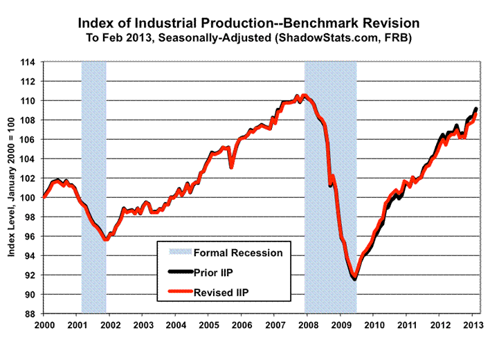 Still Living with the 2008 Crisis. There never was an actual recovery following the economic downturn that began in 2006 and collapsed into 2008 and 2009. What followed was a protracted period of business stagnation that began to turn down anew in second- and third-quarter 2012 (see new detail in Commentary No. 530). The official recovery seen in GDP has been a statistical illusion generated by the use of understated inflation in calculating key economic series (see No. 527: Special Commentary, Commentary No. 528 and Public Comment on Inflation). Nonetheless, given the nature of official reporting, the renewed downturn likely will gain recognition as the second-dip in a double- or multiple-dip recession. Where chances are increasing of a sharp slowing in headline second-quarter 2013 GDP, possibly an outright contraction, downside revisions to GDP in recent years also loom in the July 31st comprehensive benchmark revision to the GDP series.