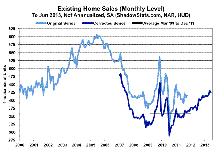 June 2013 Existing- and New-Home Sales. In the wake of the housing crash, which began in 2006 for the construction industry (sales actually began slowing 2005), activity in both existing- and new-home sales still has been relatively stagnant, although an uncertain uptrend has developed in the unstable existing-home sales reporting. New-home sales have shown a minor uptrend, but the ongoing monthly changes generally remain well within the limits of being statistically-insignificant or within the limits of normal instabilities within the series.