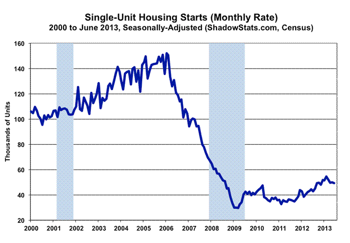 Despite all the positive spin given by the financial media to the slow uptrend in the housing market, the consumer remains severely constrained by structural liquidity issues, as discussed in the Opening Comments. The level of activity in June 2013 remained 64.2% below the July 2005 pre-recession high. That is reasonably consistent with starts for single-unit houses in June 2013, which held at 67.6% below the January 2006 pre-recession high, as reflected in the graphs, also in the Opening Comments.