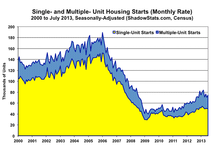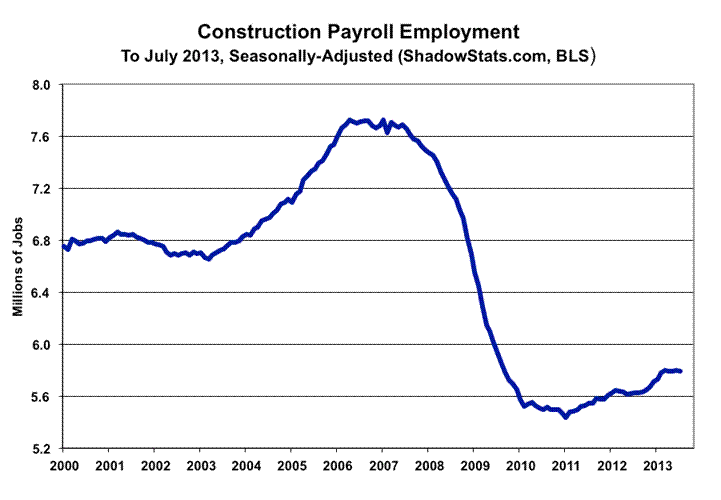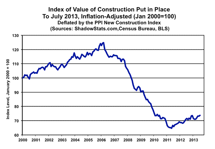 The preceding two graphs reflect total construction spending through July 2013, the first is before inflation adjustment; the second is an aggregate index reflecting inflation-adjusted data. The second graph (see also Opening Comments) shows the July 2013 ShadowStats estimation of an inflation-adjusted construction spending series. There is no perfect inflation measure for deflating construction, but the PPI new construction index is the closest found in publicly available series. Adjusted for the PPI measure, construction spending shows the economy slowing in 2006, plunging into 2011 and then turning minimally higher in an environment of low-level stagnation, through the most-recent reporting. The pattern of inflation-adjusted activity here does not confirm the economic recovery shown in the headline GDP series (see Commentary No. 552). To the contrary, the latest construction reporting, both before and after inflation adjustment, shows a pattern of ongoing stagnation.