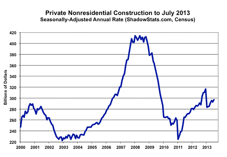 Construction-Spending Increase Was Insignificant, Once Again. Total construction spending in July 2013 continued a pattern of monthly, low-level stagnation. Although the general trend has been minimally to the upside since 2011, monthly changes rarely have been significant. The broad pattern of activity has been one of plunge (starting in 2006) and stagnation (starting in 2011), not the hyped-GDP pattern of plunge (starting at the end of 2007) and ever-after recovery (starting in mid-2009).