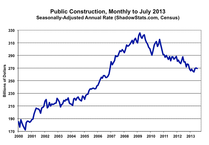 The statistically-insignificant 0.6% gain in monthly July 2013 construction spending included a 0.3% monthly contraction in public construction spending, versus a revised 0.3% month-to-month gain (previously a 1.1% contraction) in June. July private construction was up by 0.9%, following a revised 0.2% (previously 0.4%) contraction in June.